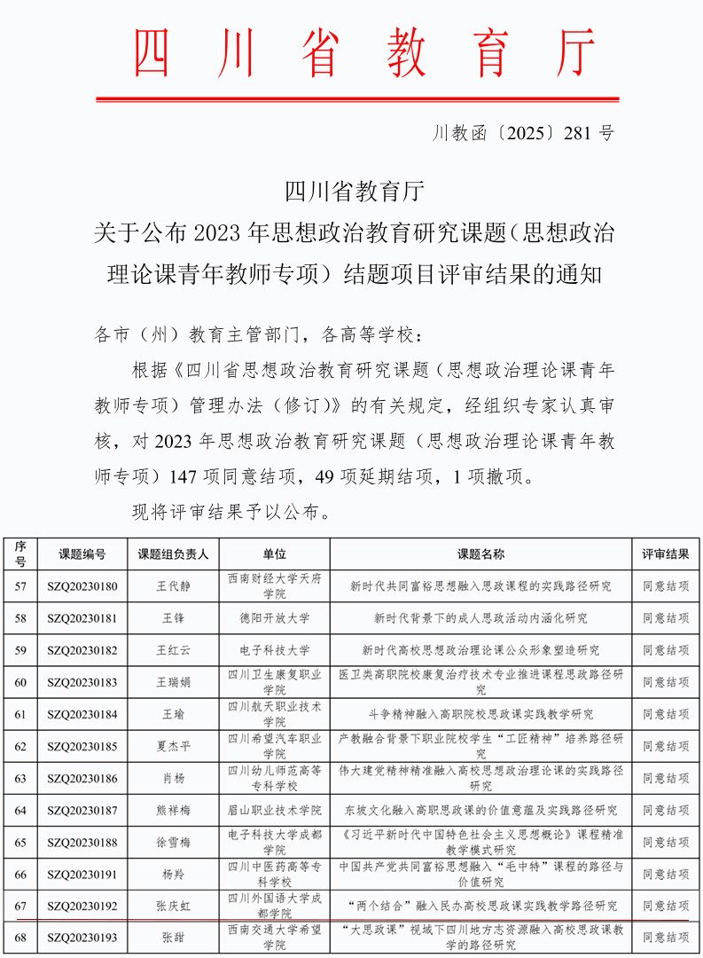 近日,根据《四川省思想政治教育研究课题(思想政治理论课青年教师专项)管理办法(修订)》的有关规定,经组织专家认真审核,对2023年思想政治教育研究课题(思想政治理论课青年教师专项)评审结果进行了公布。由我院张庆虹教授主持的项目“两个结合”融入民办高校思政课实践教学路径研究顺利通过结题评审,圆满结项。该项目通过分析把握“两个结合”的深刻内涵和价值,通过调查研究深入了解四川省民办高校思政课实践教学的现状,从体制机制、政策保障、数字资源建设、资源投入、学术氛围、个人素养等几个方面展开,提出政府、高校、社会、个人四位一体的两个结合有效融入思政课实践教学路径。本项目的成功结题,充分彰显了我院教师扎实的科研能力与学术水平,将为相关领域的理论发展与工作实践提供有益参考。