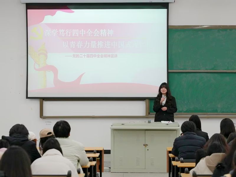 为深入学习宣传贯彻党的二十届四中全会精神,引领青年学子准确把握国家发展蓝图,自觉将个人成长融入中国式现代化伟大实践,12月14日,成都外国语学院大学生理论宣讲团在第二教学区阶梯教室A202成功举办学习贯彻党的二十届四中全会精神理论宣讲会。宣讲团阳灿、张天杰同学用大学生讲给大学生听的方式,为国际传媒艺术学院2025级的同学们带来了一场内容丰富、生动深刻的理论学习课。