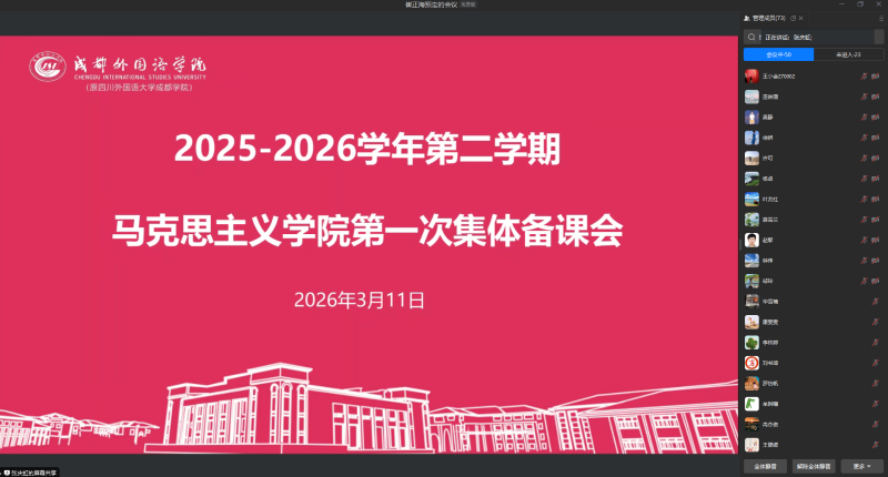 为深化教学改革,提升教学质量,我院于3月11日下午开展思政课线上集体备课会。活动由张庆虹副院长主持,成都、宜宾两校区思政教师参加。