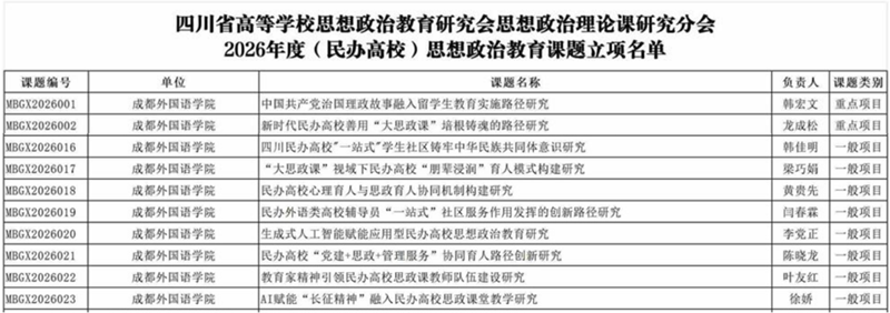 4月9日,经专家评审,根据《关于开展四川省高等学校思想政治教育研究会思想政治理论课研究分会2026年度(民办高校)思想政治教育课题中报工作的通知》的精神与要求,四川省高等学校思想政治教育研究会思想政治理论课研究分会、四川省民办高校马克思主义学院联盟秘书处立项66项(其中重点课题15项)2026年度(民办高校)思想政治教育课题。我校教师共计10项课题获批立项。其中2项重点项目、8项一般项目。