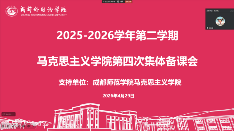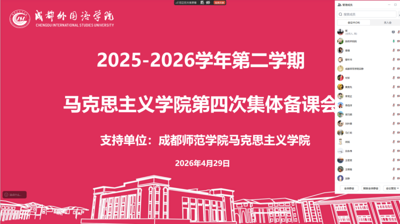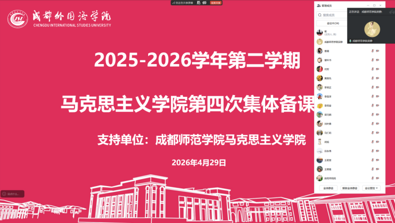 为深化马院结对共建工作,持续推进我院思想政治理论课高质量发展,不断提升思政课的思想性、理论性、亲和力与针对性,4月29日下午,我院召开2026年春季学期第四次跨校区线上集体备课会。本次会议特邀结对共建单位成都师范学院马克思主义学院专家到会指导,两院思政课教师齐聚云端,围绕重点课程开展了深入的教学研讨。